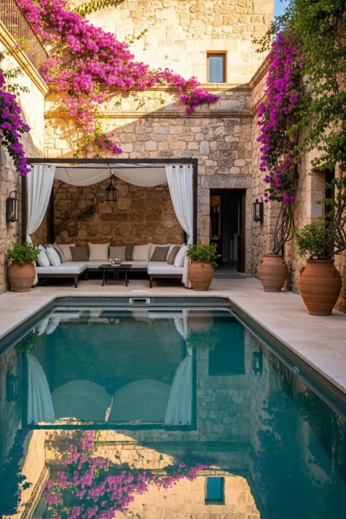 A courtyard pool offers privacy while keeping outdoor spaces cool and inviting. Even small pools work well when surrounded by stone walls and shaded seating.