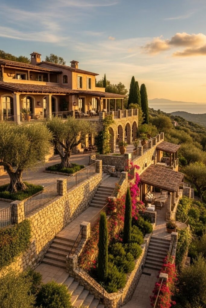 Hillside Mediterranean homes follow the natural slope of the land. Terraces, retaining walls, and stepped layouts create visual interest.