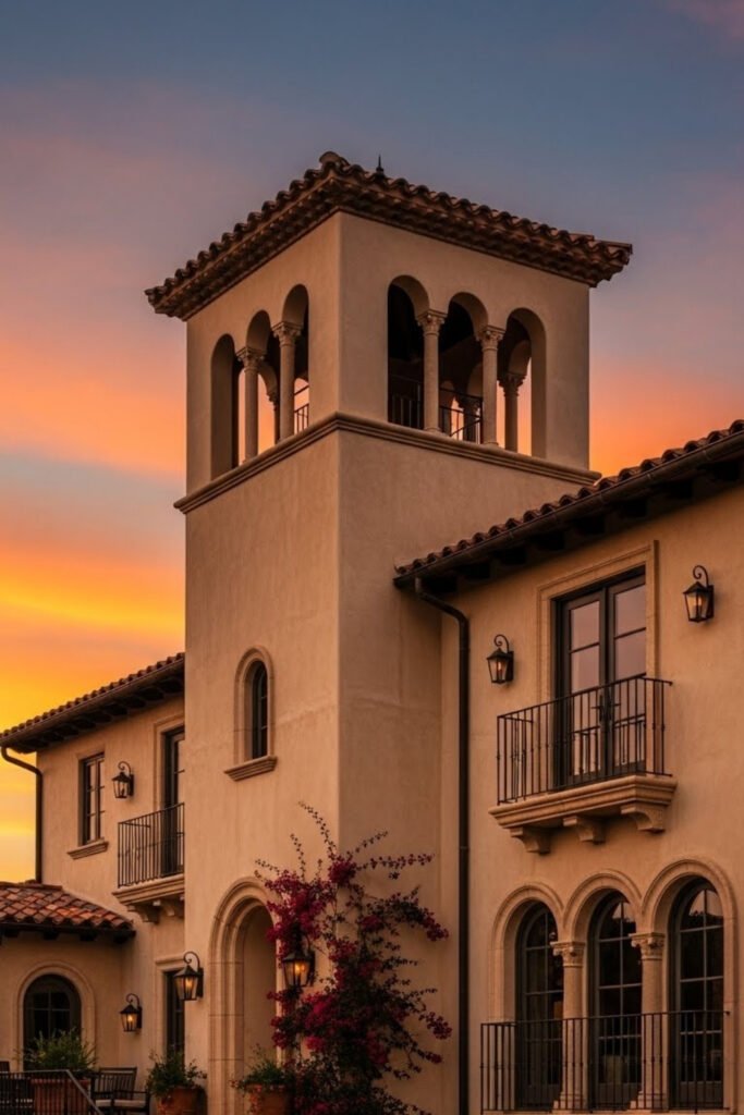 Towers often house staircases or lookout spaces and give the exterior a villa-style silhouette. When finished in stucco or stone, they feel architectural rather than decorative.