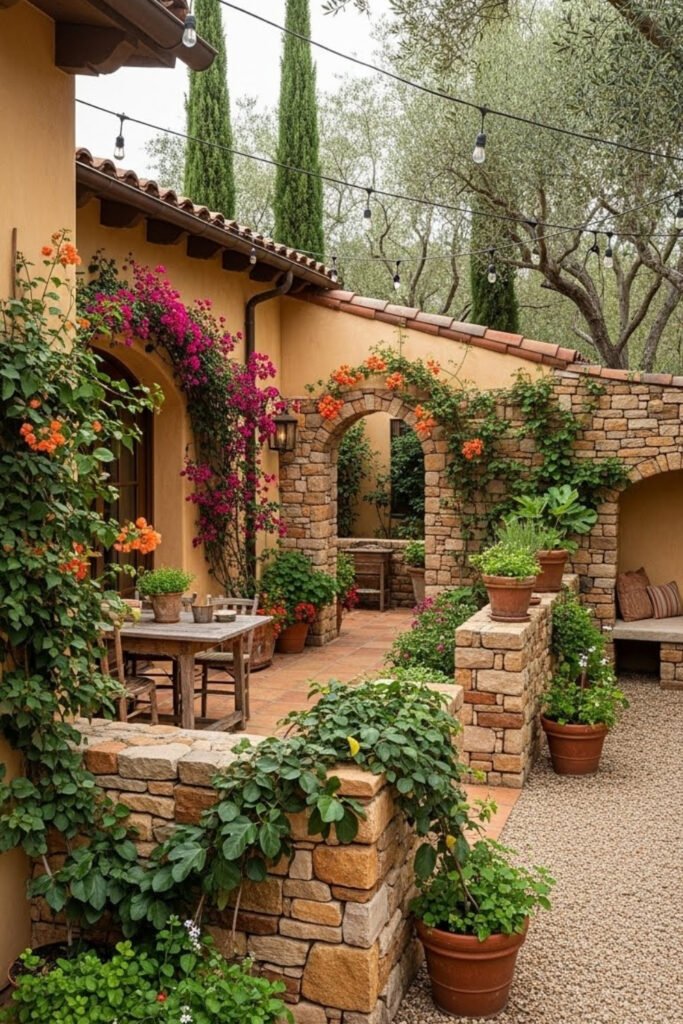 Garden walls define outdoor spaces while adding privacy and structure. Low stone or stucco walls help separate courtyards, patios, and pathways.