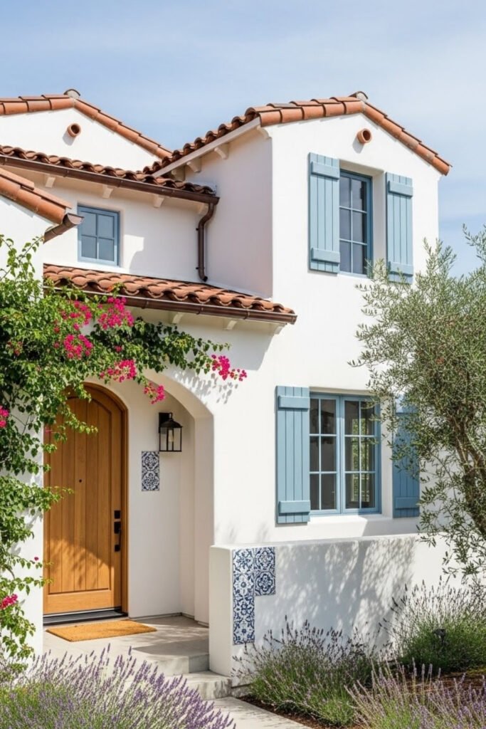 Blue accents add contrast to Mediterranean homes without overpowering the design. They work best on doors, shutters, or tile details.