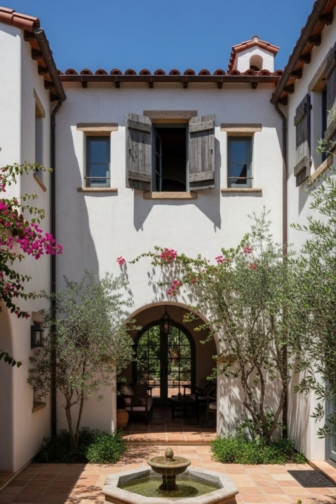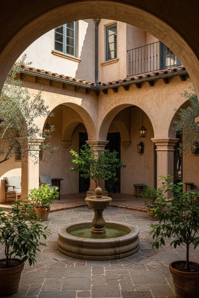 A courtyard fountain adds movement and sound that instantly makes a Mediterranean home feel calm. Even a small stone fountain works well in compact courtyards.