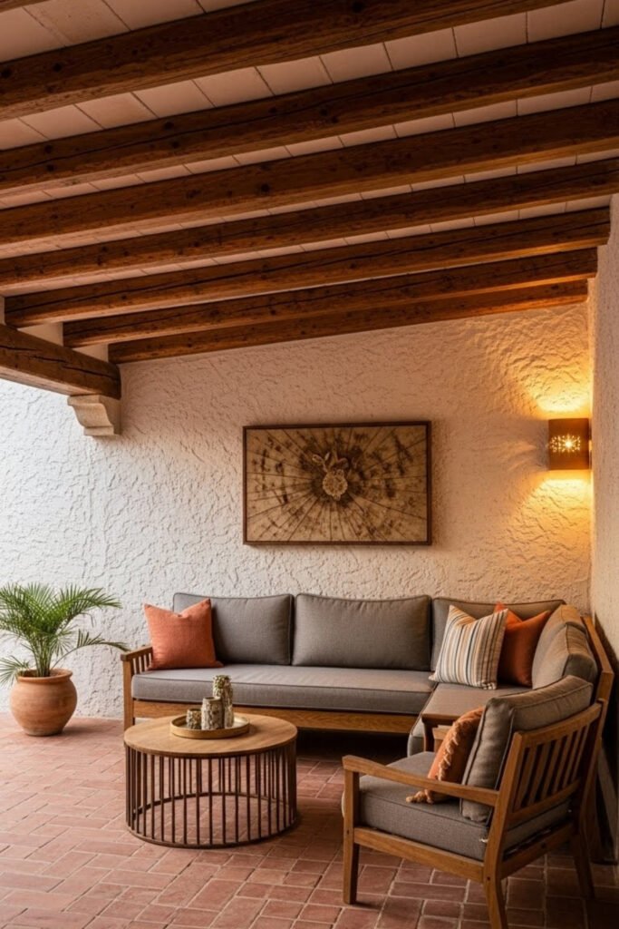 Natural or lightly stained wood keeps the look authentic. This feature pairs nicely with stucco walls and stone floors, adding depth without overwhelming the space.
