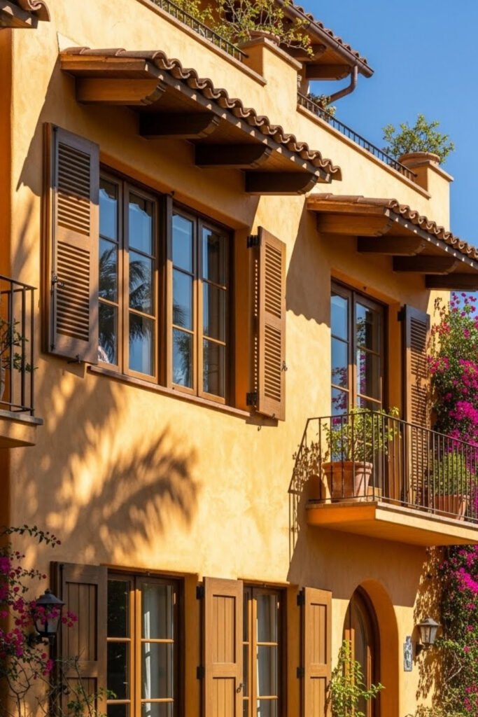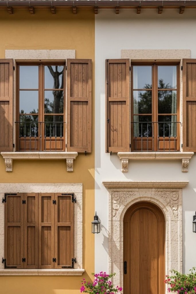 Wooden shutters in neutral or muted colors keep the exterior balanced. This idea works especially well on stucco walls, where shutters add contrast without making the design feel busy.