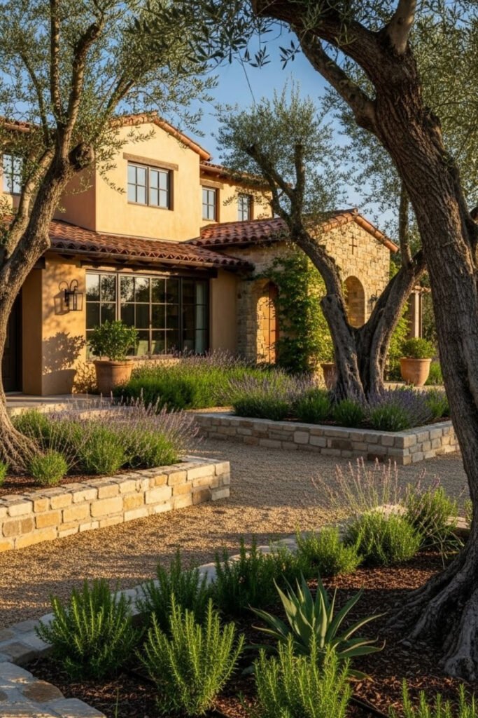 Olive trees are a classic Mediterranean landscaping choice that instantly sets the tone. They thrive in dry climates and require minimal maintenance once established.