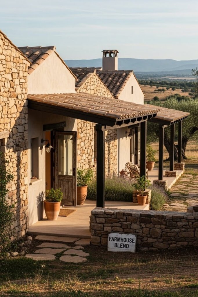 This idea mixes Mediterranean architecture with rustic farmhouse elements. Think stone walls, simple rooflines, and exposed wood details.
