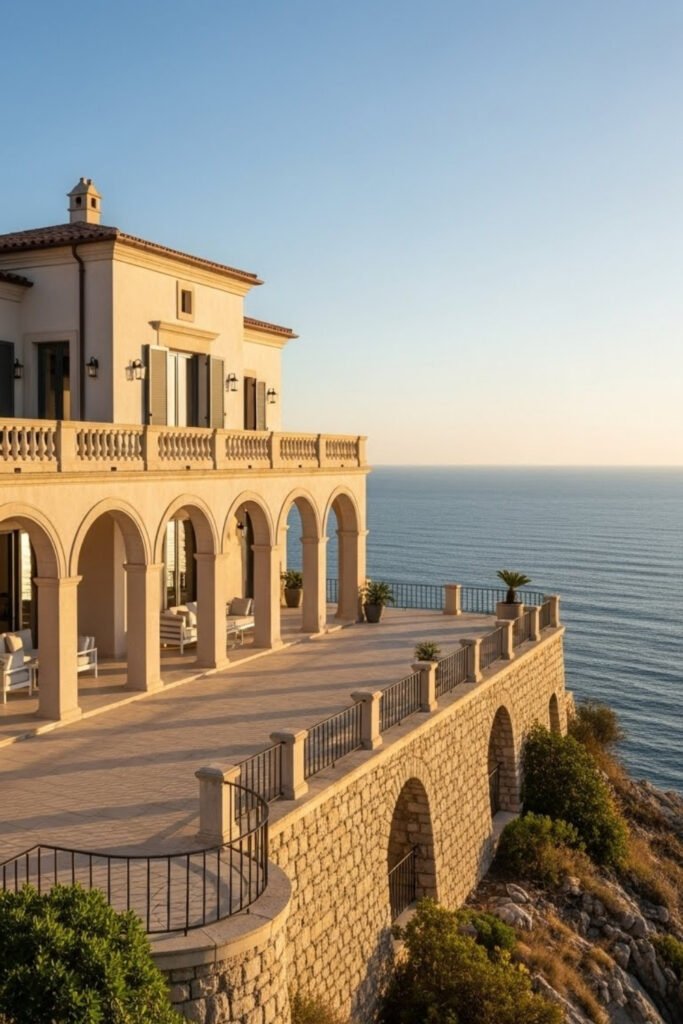 Cliffside Mediterranean homes focus on views, light, and openness. Large windows, terraces, and balconies face outward to capture sea or hillside scenery. This layout works best with simple exteriors so the landscape becomes the main feature.