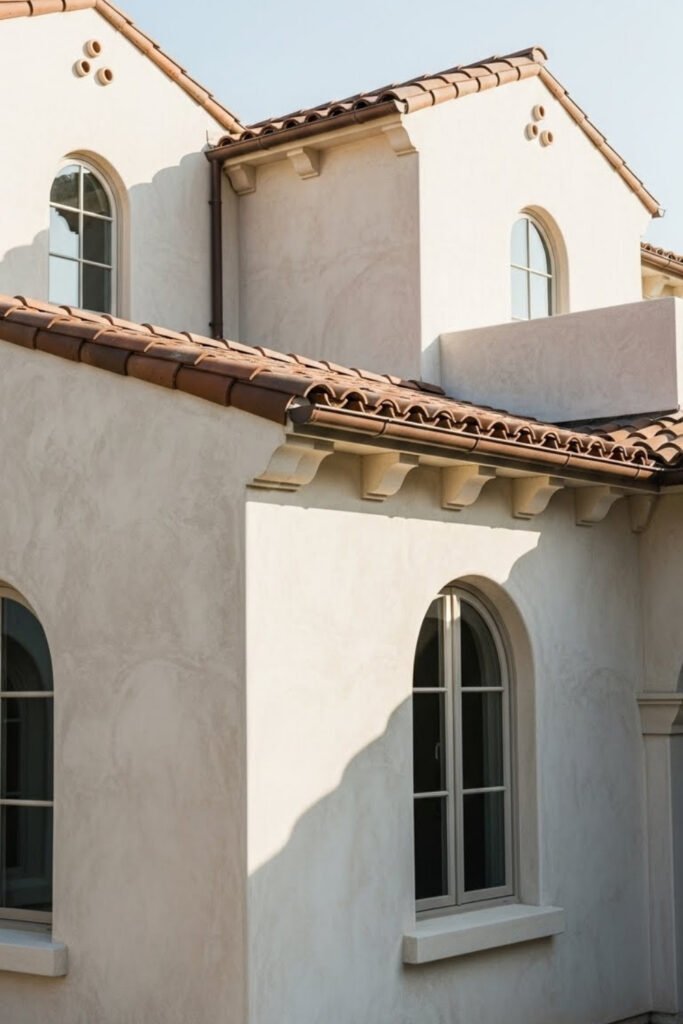 Wrought iron balconies add classic Mediterranean charm while keeping the exterior light and airy. They work well on upper floors or courtyard-facing rooms.