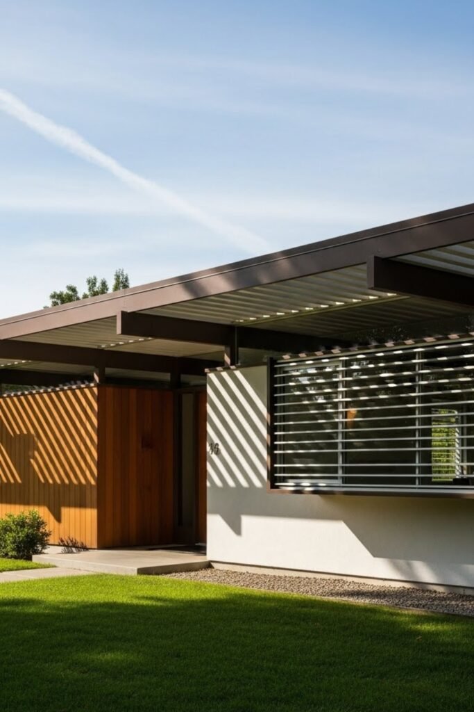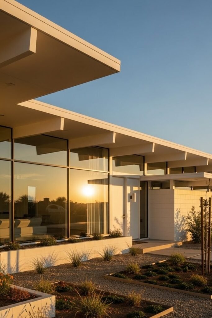 Low rooflines are a signature of mid-century modern exteriors. The roof sits close to the ground, creating a strong horizontal feel that visually stretches the home wider.