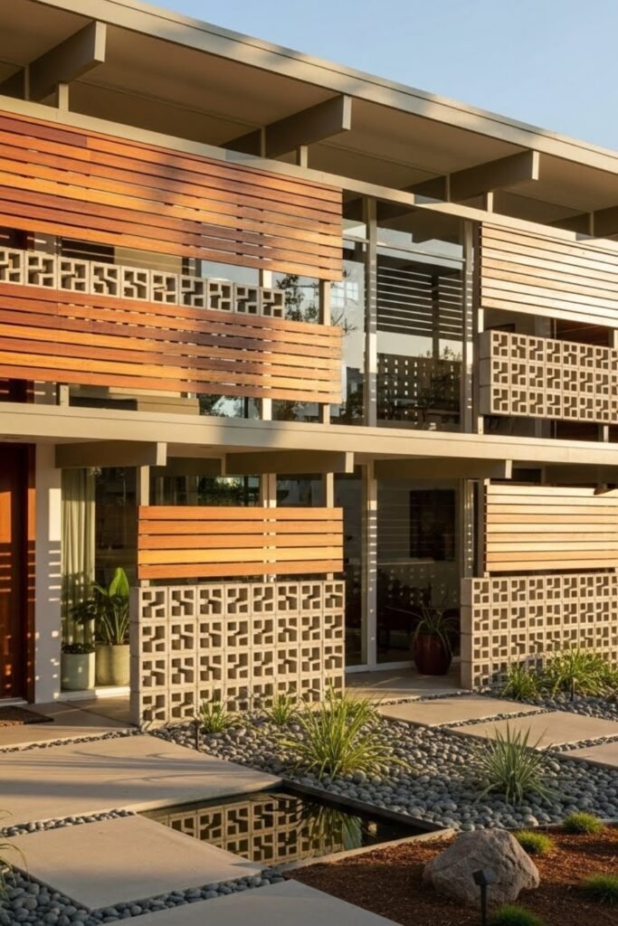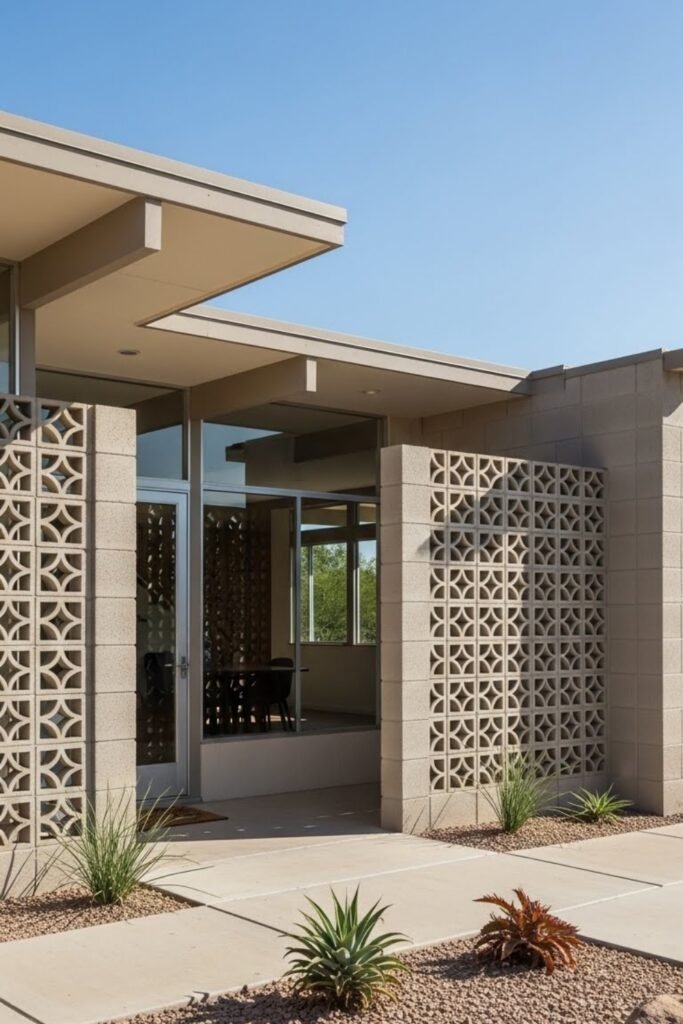 Concrete block walls add texture and authenticity to mid-century modern exteriors. Decorative or solid block patterns are often used for privacy screens or feature walls.