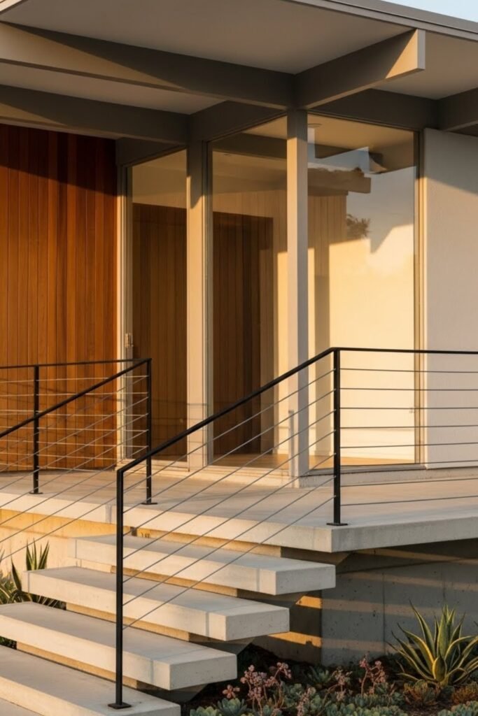 Slim metal railings keep the exterior light and visually open. Thin steel or iron lines are used for entry steps, patios, or split-level edges without overpowering the design.