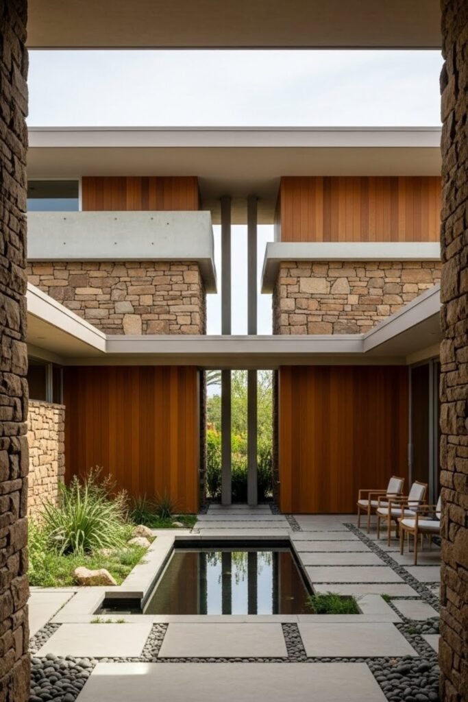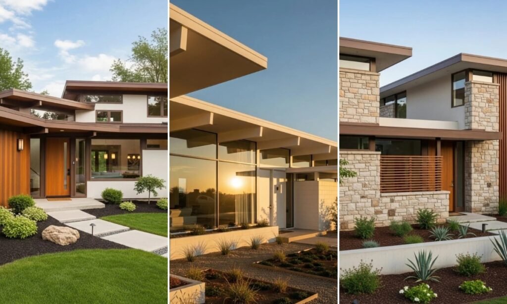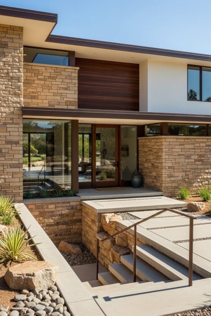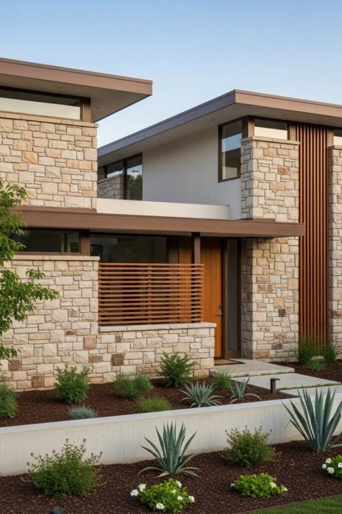 Stone accents add natural texture to a mid-century modern exterior. Rough-cut or stacked stone is often used on entry walls, columns, or feature sections to balance sleek lines.