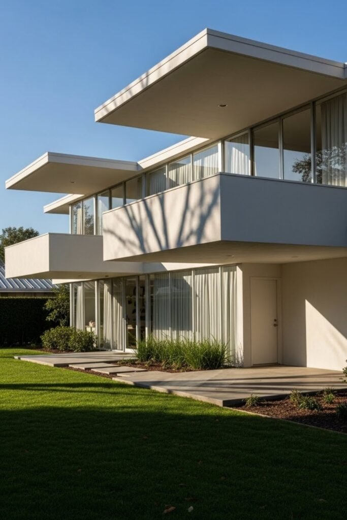 Flat roof overhangs extend outward to provide shade and depth. They protect windows from harsh sunlight while reinforcing clean horizontal lines.
