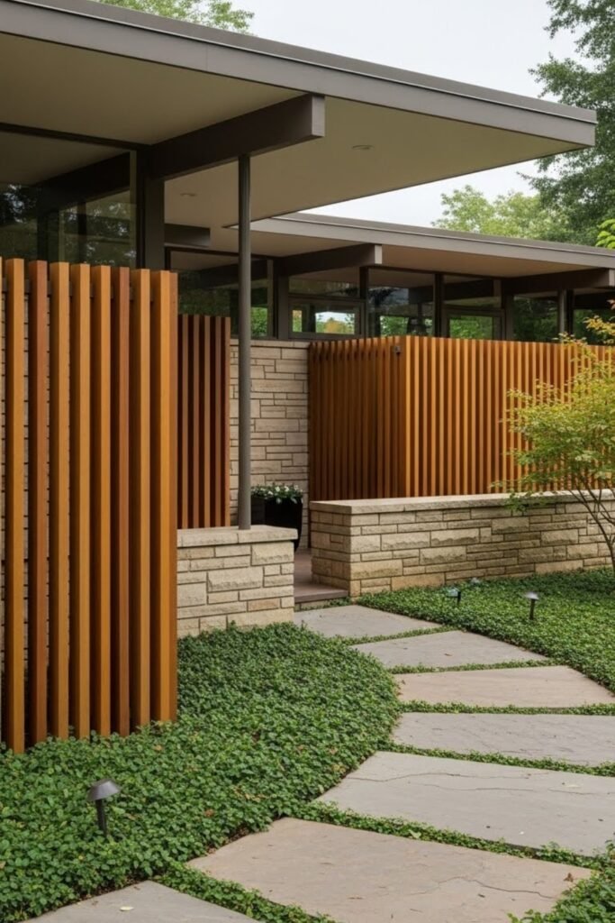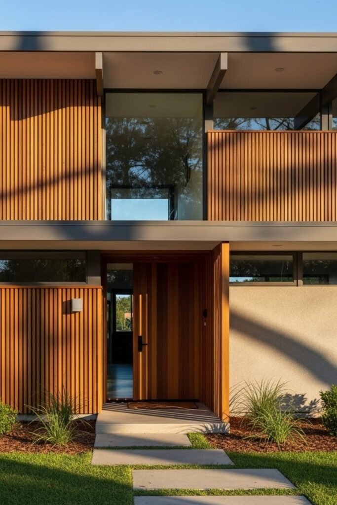 Wood slats soften the clean geometry of mid-century exteriors. Vertical or horizontal slat walls add warmth while maintaining a modern feel.