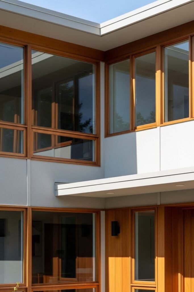 Wood-framed windows add warmth and authenticity to mid-century exteriors. Natural wood tones soften glass-heavy facades and balance concrete or stucco surfaces.