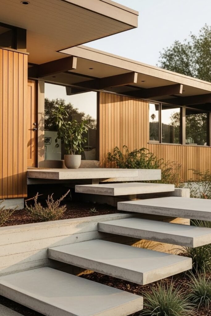 Wide, low-profile steps create a smooth approach to a mid-century modern home. Instead of steep stairs, this design spreads the entry across a wider area, reinforcing horizontal lines.