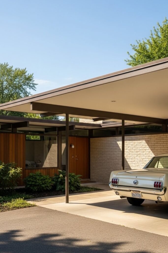 An open carport replaces a traditional enclosed garage. Supported by slim columns or beams, it keeps the exterior airy and functional.