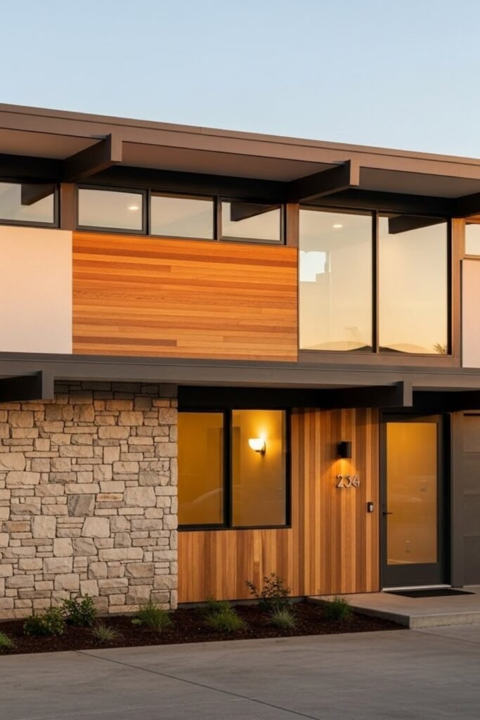 Mixed materials combine wood, stone, stucco, and concrete within one facade. The contrast adds visual richness while maintaining a cohesive look.