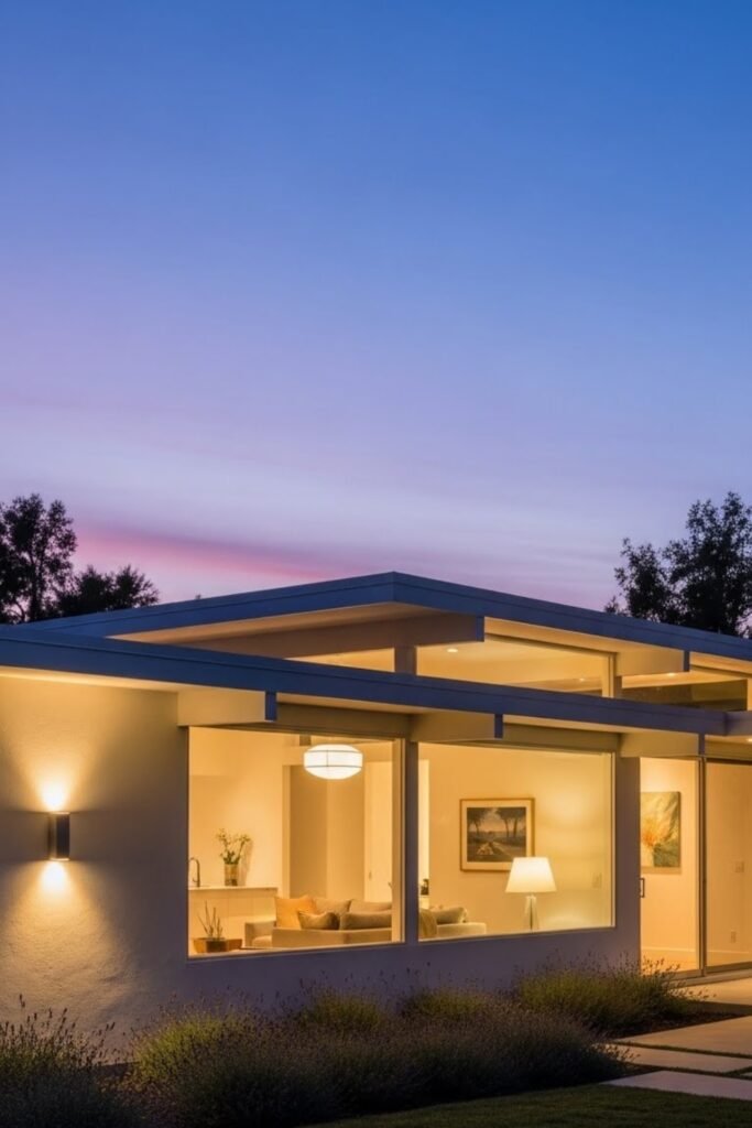 This approach enhances the home’s shape at night while maintaining a clean mid-century modern look.