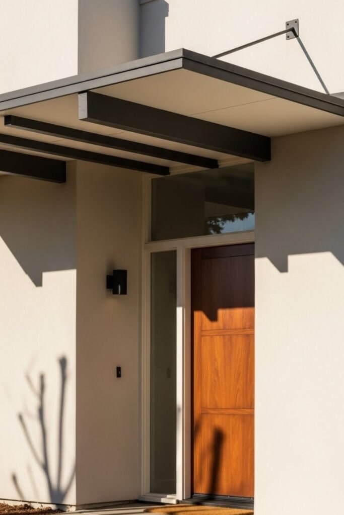An entry canopy extends outward from the facade, often with a flat roof and minimal supports. It creates a clear focal point for the entrance while adding architectural depth.