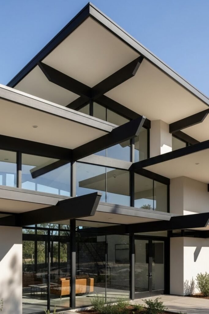 Angular roof designs introduce sharp geometry to mid-century modern exteriors. Slanted or intersecting roof planes create movement and visual tension.