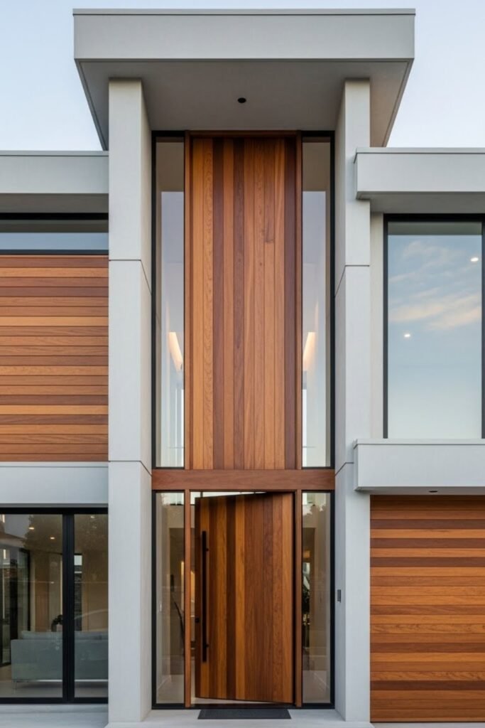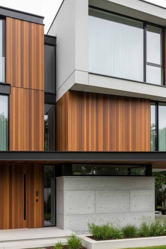 Vertical wood slats add warmth to modern exteriors without losing a clean look. They work as cladding, privacy screens, or accent walls and pair well with concrete or stucco.