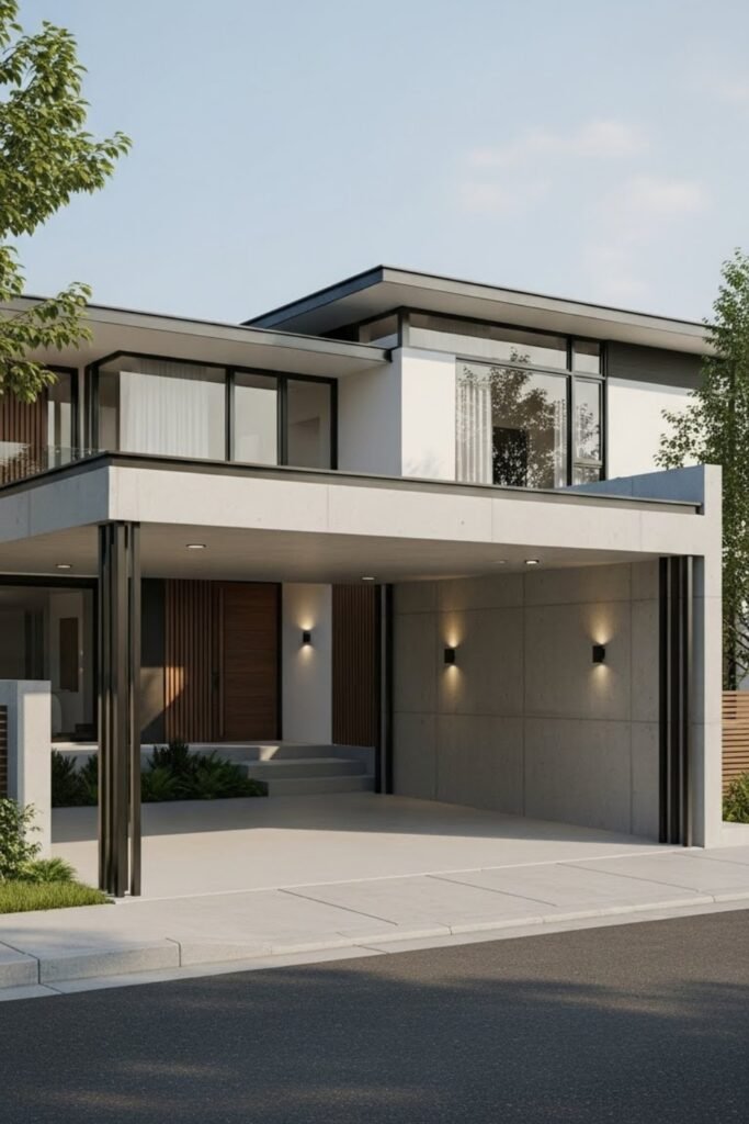 A modern carport replaces bulky garages with open, flat-roof structures integrated into the home’s design.