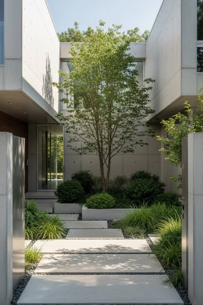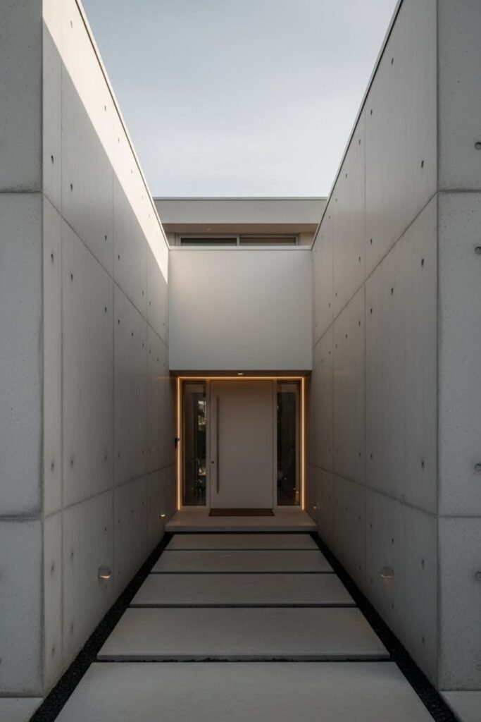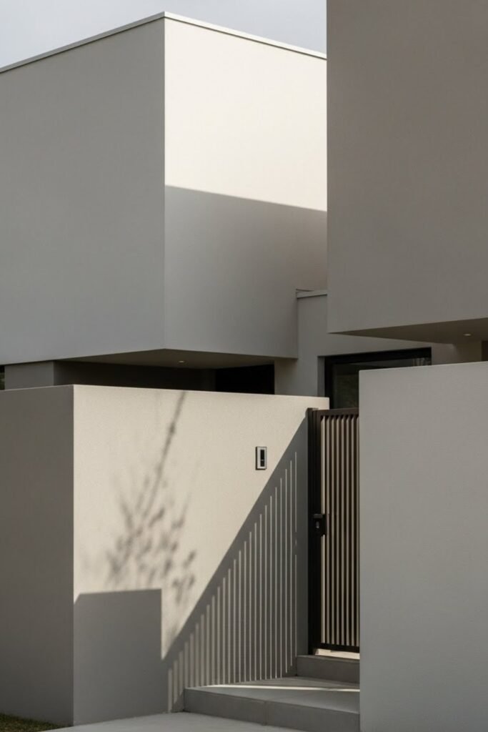 A courtyard-focused exterior brings the entrance inward instead of facing the street directly. Walls or volumes frame an open central space, creating privacy and calm before entering the home.