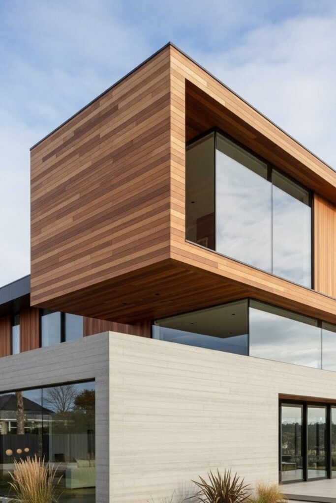 Using multiple exterior materials creates layers and contrast in modern house design. Wood, concrete, metal, and glass can be combined in controlled sections to avoid visual clutter.