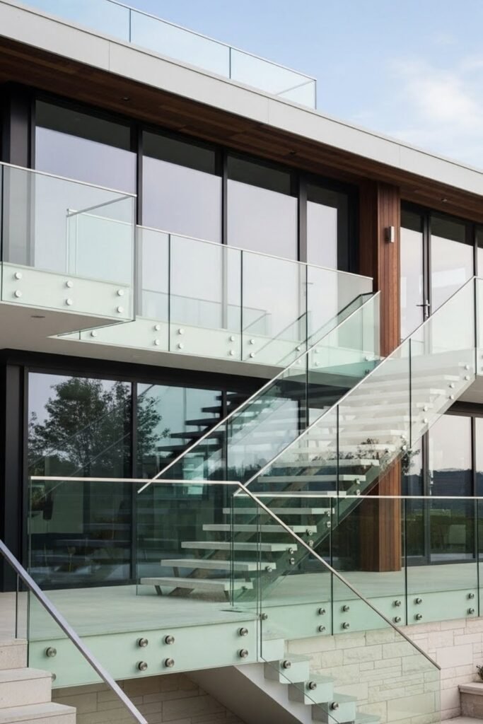 Glass railings create a clean, uninterrupted look for balconies and terraces. Clear or lightly frosted panels keep the exterior open and modern while maintaining safety.