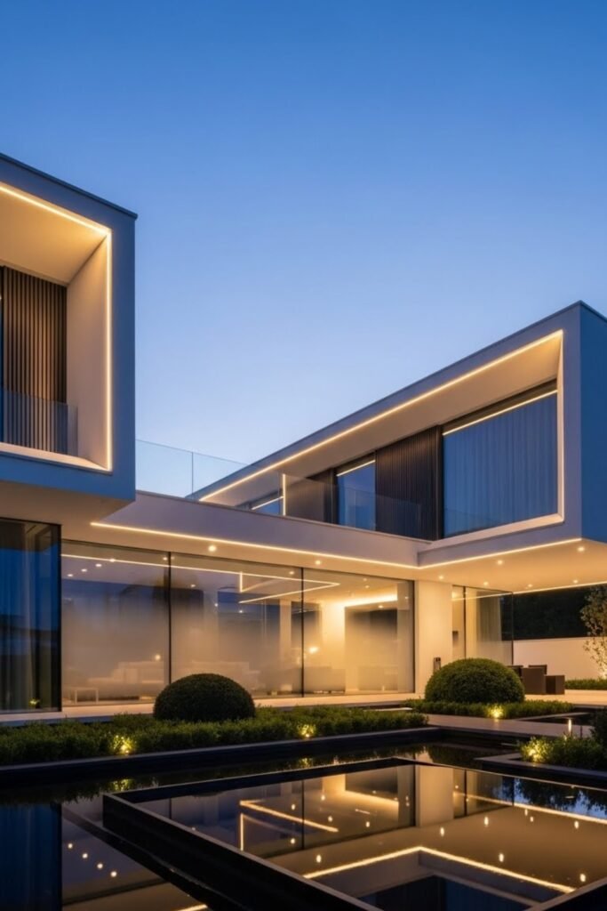 Integrated LED lighting highlights architectural lines and edges on modern house exteriors. Linear lights placed under rooflines, along walls, or near steps enhance depth at night without overpowering the design.
