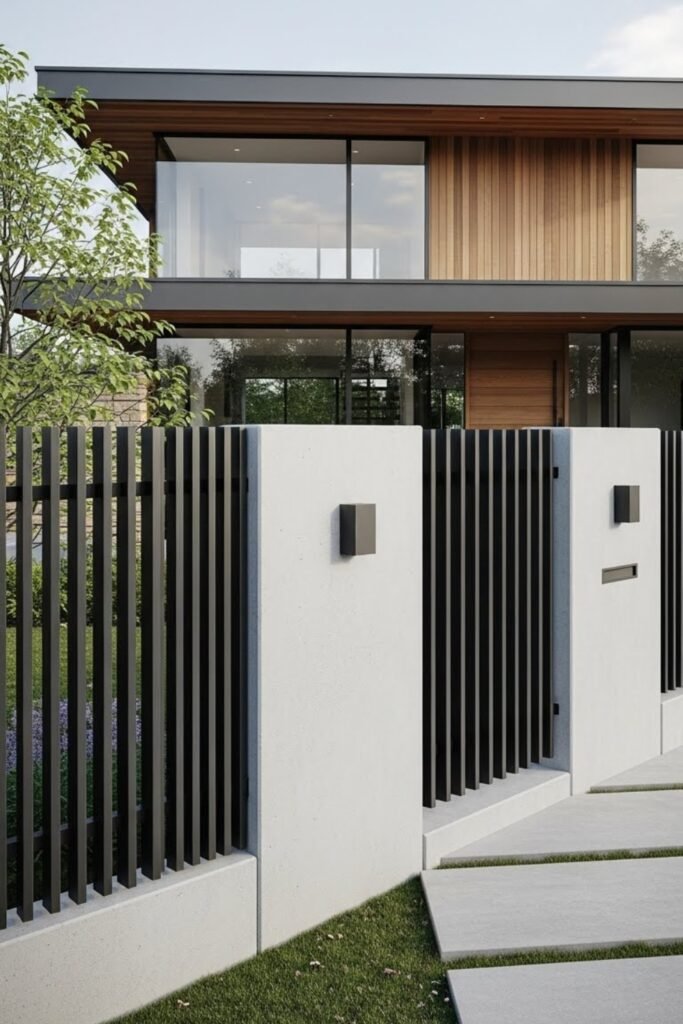A minimal fence uses simple metal slats, concrete panels, or low-profile walls to complement modern architecture.