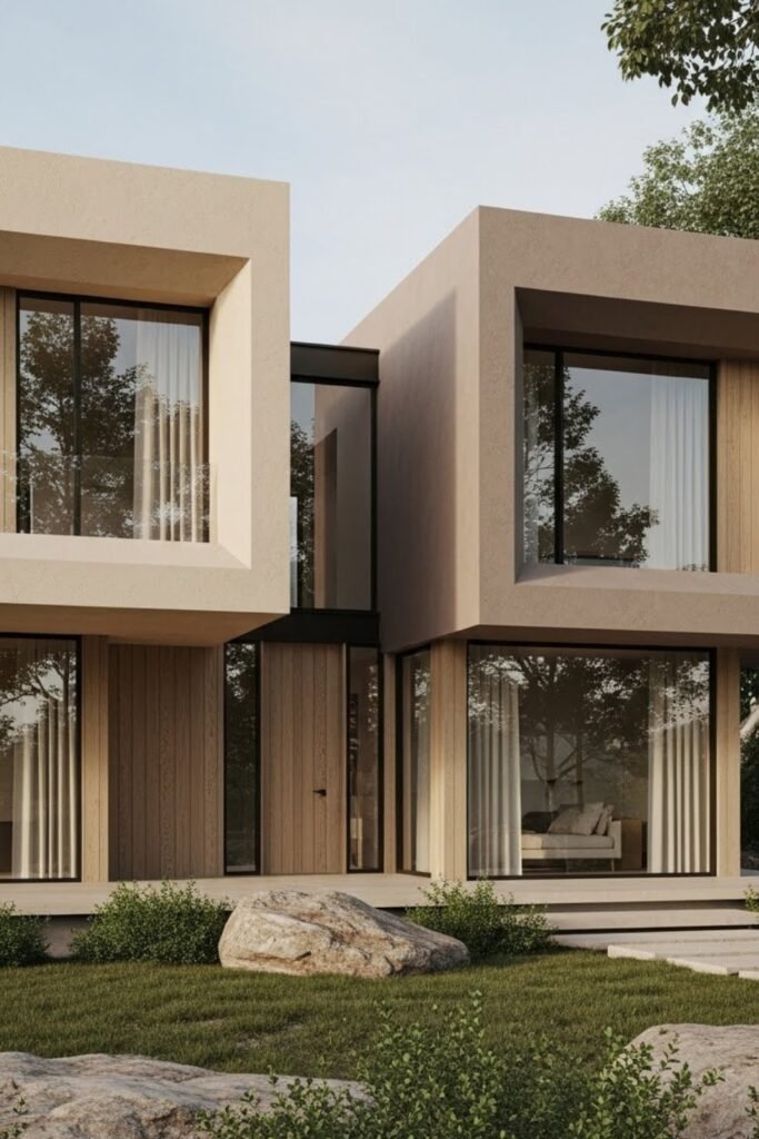 Earth-tone modern exteriors use warm shades like sand, clay, taupe, and soft brown. These colors soften modern lines while blending naturally with surroundings.