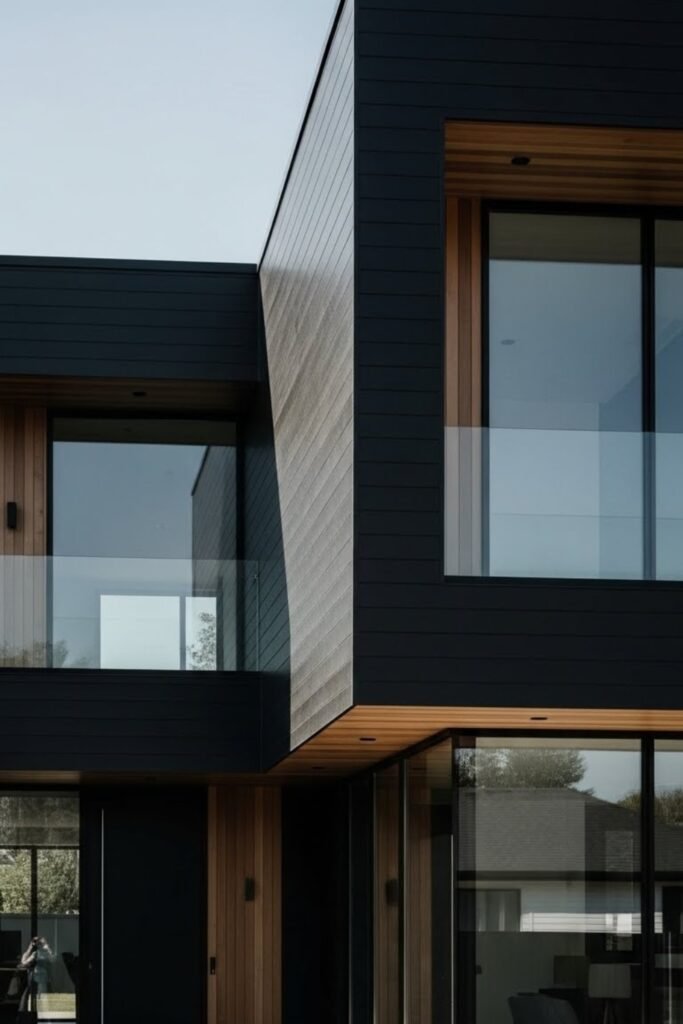 A black modern exterior uses matte or satin finishes to create a bold, refined look. Dark siding highlights clean lines, sharp edges, and minimalist forms.