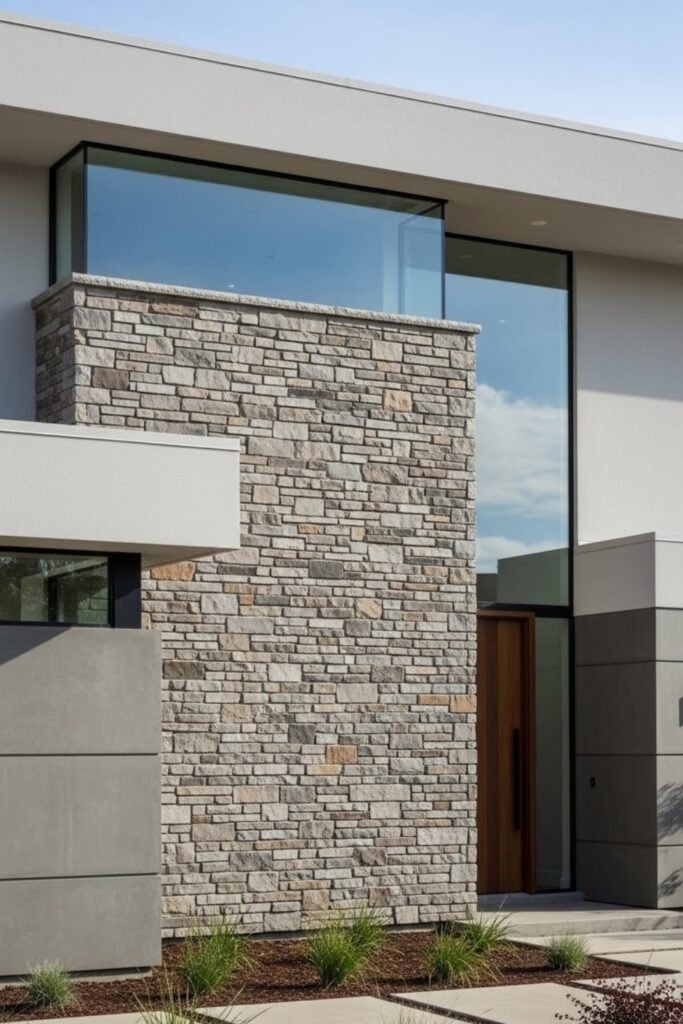 A stone accent exterior uses one section of natural or engineered stone to anchor the design. Instead of covering the whole house, stone is applied selectively to highlight volume or entry areas.