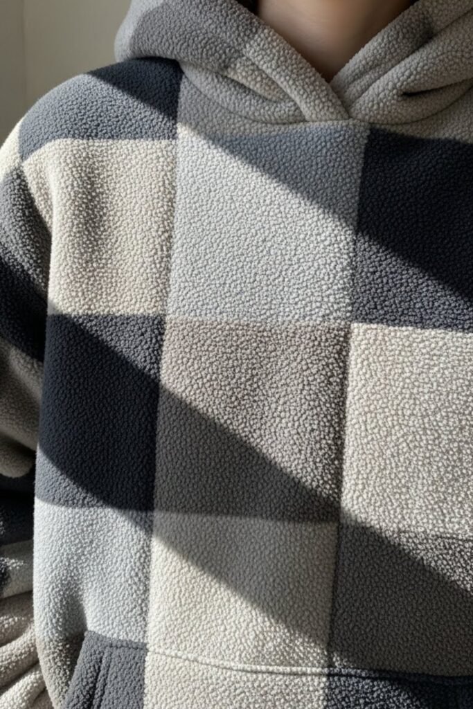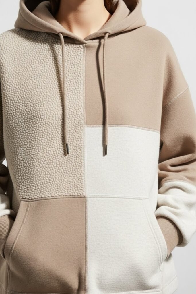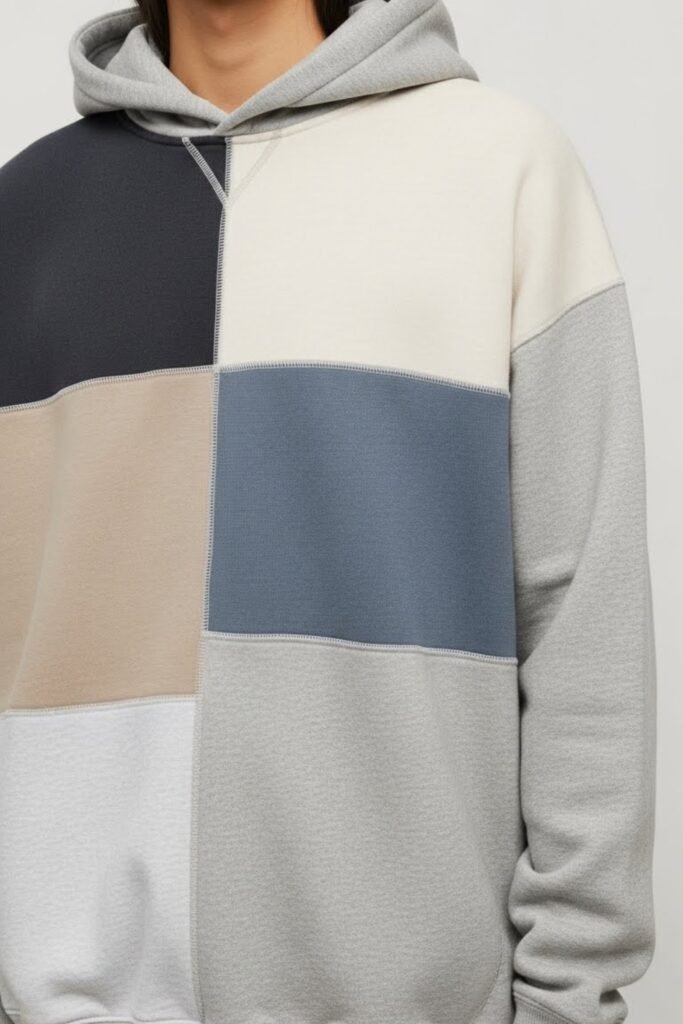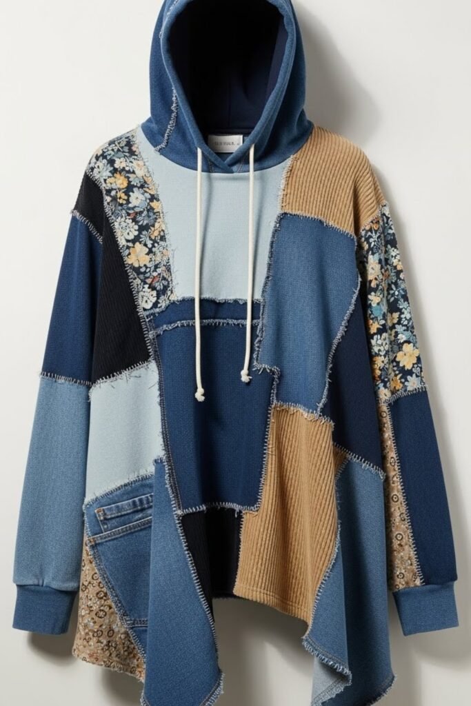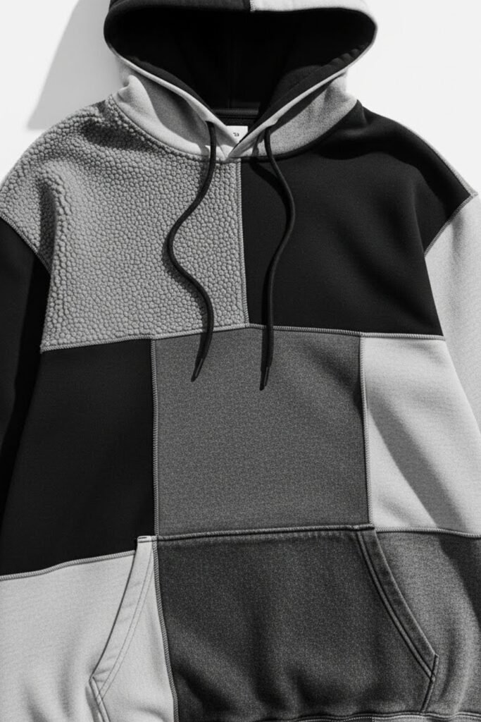 Design an oversized hoodie with large, uneven patch panels. The loose shape hides seams and makes the patchwork feel intentional.