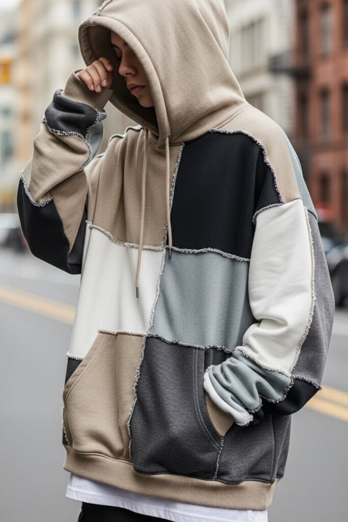 This idea works great for modern streetwear styles and helps use leftover fabric efficiently without the hoodie feeling chaotic