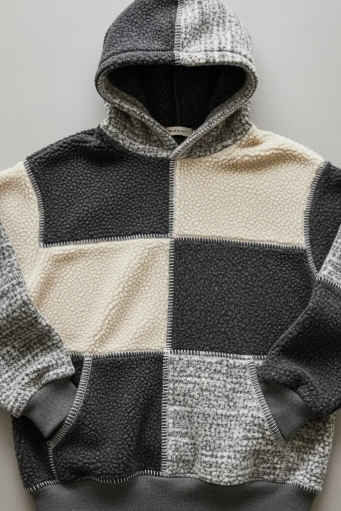 This makes the hoodie practical instead of just decorative. Patchwork helps control warmth while keeping the design unique