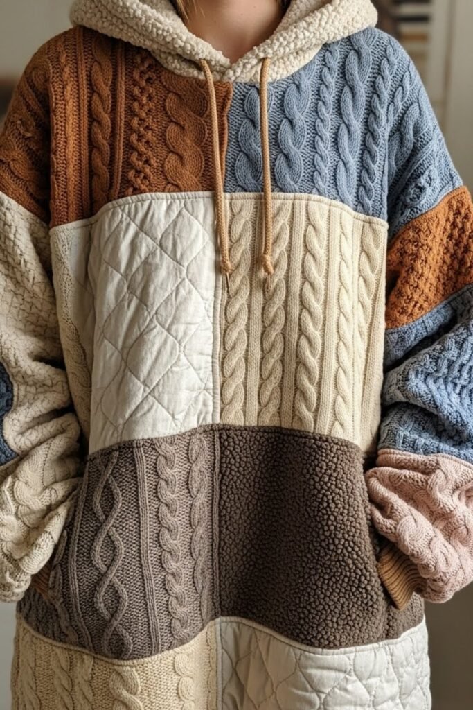 Turn a thin quilt or blanket into patchwork sections for a warm hoodie. The stitched texture adds depth while keeping the design cozy.