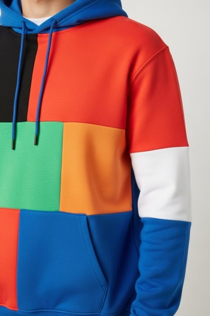 Create a patchwork hoodie using solid-color fabric scraps in bold or muted tones. Keep the patch shapes clean and geometric so the design looks intentional.