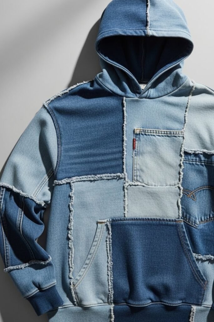 Use old jeans in different washes to build a patchwork hoodie with character. Cut panels from worn areas like knees or pockets for extra texture.