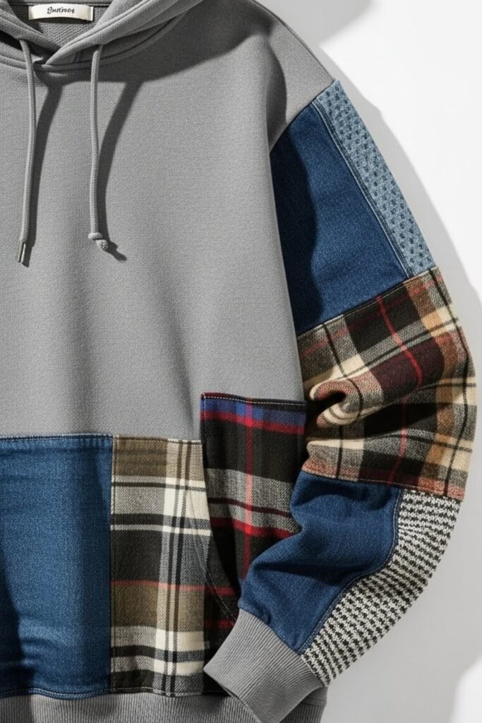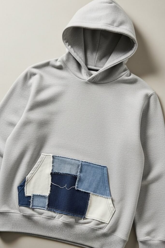 Add patchwork only to the front kangaroo pocket while keeping the rest of the hoodie plain. This small detail adds personality without overpowering the design.