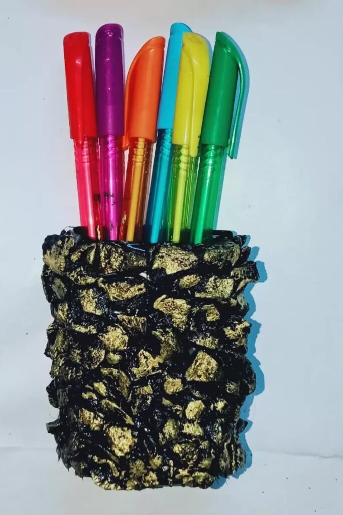 This rugged pen holder works well on creative workstations where bold textures help break plain desk surfaces and highlight colorful stationery easily.