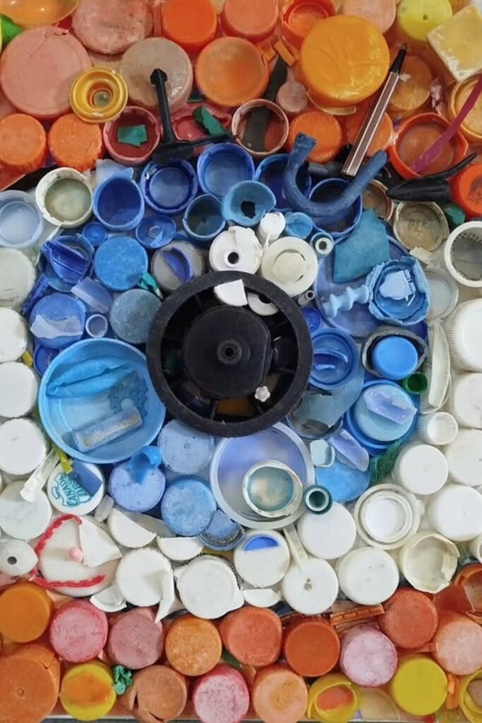 Create this striking bottle-cap mural when you want a dramatic statement piece that turns leftover plastic lids into meaningful recycled artwork.