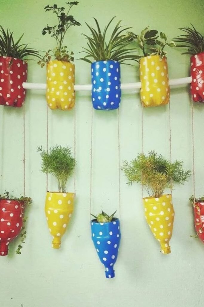 Cut bottles evenly, paint bold colors with scattered dots, then thread sturdy jute cords through small holes for balanced vertical hanging.