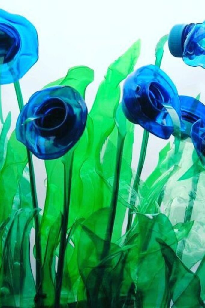 Cluster them into a recycled bottle vase, using clear plastic strips as filler to support the arrangement while keeping everything lightweight.