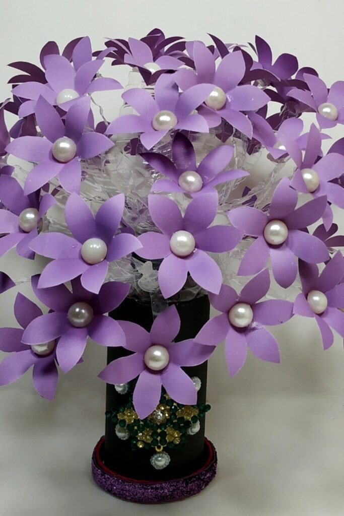 Cut petal shapes from colored sheets, curl edges slightly for depth, then glue pearl centers to elevate each flower’s finished look.