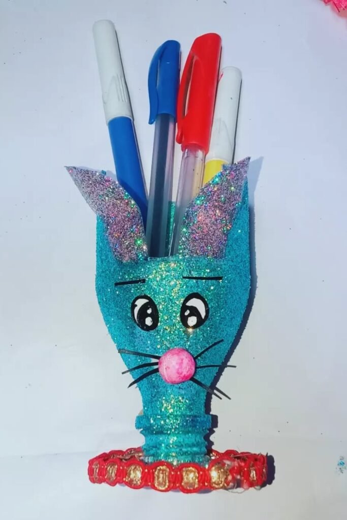 Use this glitter cat holder when organizing pens for homework desks where kids enjoy cheerful designs that encourage tidy habits naturally.