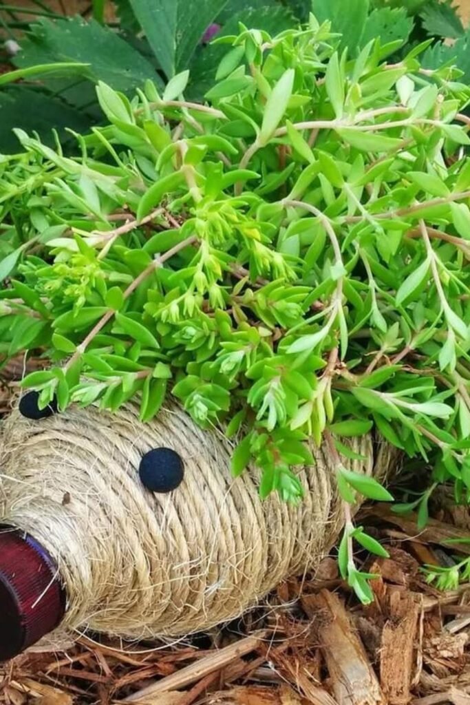 Push trailing plants through the top opening so greenery mimics hedgehog spikes, blending humor with practical ground coverage.