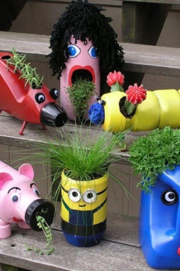 Play with exaggerated bottle shapes to craft expressive planters that make greenery look like quirky hairstyles growing from cartoon-style heads.